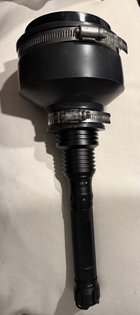 - The hose clamps allow the PVC to flex and tighten, holding your flashlight and lens.